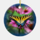 Une photo d'un papillon à queue blanche jaune qui atterrit sur une parcelle de confluents violets.
