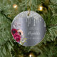 Un ornement pour un 50ème anniversaire (ou tout âge). Un arrière - plan métallique en faux argent foncé. Décoré de fleurs rose rose et violet foncé, de parties scintillant faux argentées, d'allure de goutte de peinture. Modèles pour un nom, date et âge 50. Le nom est écrit avec un script de style blanc moderne et écrit à la main. Parfait comme décor de fête d'hiver, de faveur, de garde ou un cadeau.