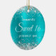 Créez votre propre ornement Sweet 16 cercle pour votre fille. Vous pouvez customiser le libellé de calligraphie "Sweet 16" ou le style de police. L'arrière - plan art numérique est doté d'une parties scintillant en faux gris argenté et d'un papier sombre bleu turquoise et brillant. À l'arrière, vous pouvez ajouter une photo de famille si vous le souhaitez. Fille 16e anniversaire ornement pour elle.