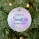 Créez votre propre ornement Sweet 16 cercle pour votre fille. Vous pouvez customiser le libellé de calligraphie "Sweet 16" ou le style de police. L'arrière - plan de l'art numérique présente une parties scintillant gris argenté et un papier peint irisé arc-en-ciel pastel... ces éléments s'impriment comme une photo. À l'arrière, vous pouvez ajouter une photo de famille si vous le souhaitez. Fille 16e anniversaire ornement pour elle.