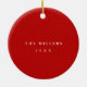 Un ornement festif avec une couronne circulaire de confetti en parties scintillant d'or avec photo du client au centre sur le devant. Le dos a une zone de texte incluant le nom de famille et l'année sur un arrière - plan rouge festif qui est personnalisable pour répondre à vos besoins. C'est parfait pour offrir une saison de don ou ajouter un souvenir commémoratif à votre propre arbre. Idéal pour les nouveau-nés, les jeunes mariés, les diplômés, les enfants, les familles et les animaux domestiques.