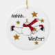 Un bonhomme de neige avec une longue patinoire rouge foulard entouré d'étoiles d'or et le texte dit "Hahh...Hiver !" sur notre ornement de vacances de Snowman de patinage sur glace.