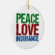 A cute insurance agent Christmas ornament featuring green, red, and blue letters that read Peace Love Insurance. Great gift for your insurance company co-workers.