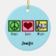 Joli ornement de Noël musicien personnalisé avec un signe de paix, le coeur, une clef et un personnel musical. Cadeau cool PEACE LOVE MUSIC pour un compositeur, un professeur de musique, un directeur de groupe ou un chef de choeur à donner à leurs étudiants en musique.
