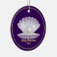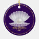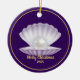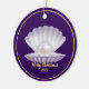 Cet ornement en céramique, illustré d'une jolie coquille décorative dans les tons violets et blancs avec l'image d'une perle brillante à l'intérieur. Le texte personnalisable de "Joyeux Noël 2025" est en or. A une bordure couleur or. Les images sont imprimées à l'avant et à l'arrière. Si vous customisez, n'oubliez pas de customiser les deux côtés de cet ornement. Customisez cet objet avec ce modèle ou achetez comme indiqué. Image sous licence
