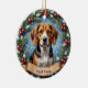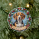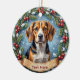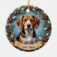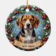 A beautiful, ultra-detailed Christmas ornament design featuring a realistic portrait of the breed centered within a soft, festive winter frame. This elegant design includes pine branches, red berries, and snowflakes against a snowy backdrop, illuminated by warm holiday lighting. The balanced, round composition includes clear space below the dog for customization.