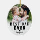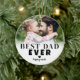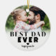 Meilleur Père Jamais Personnalisé Ornement Photo de Noël. Cette décoration personnalisée est une façon significative de célébrer papa pendant la saison des fêtes. Avec une photo différente de chaque côté, c'est un souvenir chaleureux qui capture les souvenirs préférés et ajoute une touche personnelle à votre arbre de Noël. Le devant présente "Best Dad Ever" en typographie audacieuse et moderne avec une photo—parfait pour un moment de douceur entre papa et ses enfants. Vous pouvez également passer à "Best Dad By Par" pour les amateurs de golf. L'arrière comporte une deuxième photo avec un dégradé noir doux en bas, où l'année et un petit accent du coeur sont affichés. Le design est propre et moderne, avec des polices et des couleurs entièrement personnalisables. Un cadeau parfait pour Noël ou juste pour rappeler à papa combien il est aimé à chaque fois qu'il regarde l'arbre.