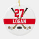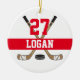Nom du joueur de hockey personnalisé Numéro de l'ornement de Noël rouge avec bâtons de hockey