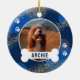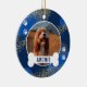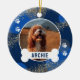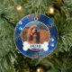 Un ornement moderne pour animaux de compagnie avec un arrière - plan bleu cool, des cercles abstraits, des taches d'or, des empreintes de pattes, une photo de votre chien ou chat, et un os avec leur nom.