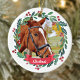 Décorez votre arbre ou offrez un cadeau spécial cette saison de vacances avec cette élégante photo d'animal de compagnie dans un ornement design de couronne de noël, et décoration assortie. Cet ornement de Noël de cheval est doté d'une couronne verte et rouge d'aquarelle avec des saints et des baies. Personnalisez avec nom avant, il y a un an. Cet ornement de Noël de l'animal de compagnie sera un favori parmi les amateurs de chevaux, amoureux de les chiens et amoureux des animaux. Visitez notre collection pour les cartes de Noël pour animaux de compagnie assorties, la décoration de maison et les cadeaux. DROIT D'AUTEUR © 2020 Judy Burrows, Black Dog Art - Tous droits réservés. Photo Aquarelle Personnalisée Cheval pour Animaux de Compagnie Wreath Ornement en céramique de Noël