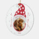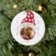 Photo d'animal de compagnie aimé dans un chapeau d'elfe à pattes de chien rouges et blanches entouré de flocons de neige et des mots À jamais dans nos cœurs. Personnalisez facilement avec la photo, le nom et l'année de votre animal de compagnie. Le cadeau idéal pour cette saison des fêtes et l'arbre de Noël.