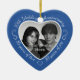 Célébrez une 10e année de mariage heureuse avec un ornement photo personnalisé dans un cadre en forme de coeur délicieux. Téléchargez simplement votre propre photo du couple marié et elle apparaîtra dans la découpe. L'entourage bleu présente une police de caractères et des décorations en caractères blancs. Les mots sont : 10ème anniversaire de Mariage - 10 ans d'amour - 10 ans de joie. Sur le dos, vous pouvez personnaliser ce keepsaké avec votre propre message et peut également ajouter l'année ou une date complète si vous préférez. Note : si vous aimez le ornement de dix ans, mais que votre coeur est fixé sur une couleur différente, s'il vous plaît contactez-moi.