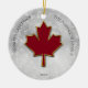 Feuille d'érable en rouge profond. Stylisé avec une bordure métallique en faux or autour des bords. Entouré d'une neige de bokeh comme un arrière - plan. Personnalisez avec vos salutations, nom et année en noir majuscules. De l'autre côté de l'ornement vous pouvez télécharger votre propre photo.