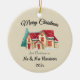 Classic round ceramic ornament featuring a watercolor illustration of a large winter house with snow and tree, "Merry Christmas" greeting, "first Christmas as" Mr & Mrs (name) and year. The background is a pearl color. The design features elegant script and modern calligraphy. The image template on back is set up for you to add one of your favorite pictures. Easily change or remove text and add photo to make it yours using the Template provided. Lightweight and ideal to mail as a thoughtful gift. See "About This Product" information on size and materials.