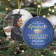 Commémorez la réussite du diplômé avec une photo personnalisée bleu, or et blanc tour de graduation ornement de Noël. Image et tout le texte sont simples à customiser. Inclure le nom et le diplôme de l'école, félicitations, merci maman et papa, ou tout autre message de votre choix. Le design comprend un arrière - plan métallique brossé royal, un bonnet de graduation en feuille d'or faux, un nom typographique moderne personnalisé, l'école et l'année de classe, et une photo de votre choix, comme une image ou une image de haut niveau de la cérémonie de début. Fait une idée de cadeau de conservation réfléchie et un ajout élégant à la décoration de maison de Noël. Félicitations au diplômé !