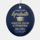 Commémorez l'exploit du diplômé avec une photo personnalisée bleu marine, or et blanc tour de graduation ornement de Noël. Image et tout le texte sont simples à customiser. Inclure le nom et le diplôme de l'école, félicitations, merci maman et papa, ou tout autre message de votre choix. Le design comprend un arrière - plan métallique bleu marine, un bonnet de graduation en feuille d'or faux, un nom typographique moderne personnalisé, une école et une année de classe, et une photo de votre choix, telle qu'une image ou une image de haut niveau de la cérémonie de début. Fait une idée de cadeau de conservation réfléchie et un ajout élégant à la décoration de maison de Noël. Félicitations au diplômé !