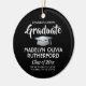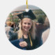 Commémorez la réussite du diplômé avec une photo personnalisée en noir et blanc tour de graduation ornement de Noël. Image et tout le texte sont simples à customiser. Inclure le nom et le diplôme de l'école, félicitations, merci maman et papa, ou tout autre message de votre choix. Le design comprend un arrière - plan noir, une casquette de graduation en faux argent gris, un nom typographique moderne personnalisé, l'école et l'année de classe, et une photo de votre choix, telle qu'une image ou une image de haut niveau de la cérémonie de début. Fait une idée de cadeau de conservation réfléchie et un ajout élégant à la décoration de maison de Noël. Félicitations au diplômé !