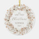 Célébrez le premier Noël du bébé avec cet ornement de gardien, avec une couronne de fleurs sauvages boho dans des tons neutres et des couleurs pastel. Le mot "Noël" apparaît dans une écriture délicate. Personnalisez l'ornement avec le nom du bébé et l'année en police sans serif d'un côté et votre photo préférée de l'autre.