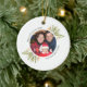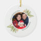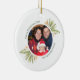 Ajoutez votre photo de vacances à cet élégant Noël blanc, doré et vert Nom de famille et ornement photo. Ajoutez une photo de famille au cadre rond, accentué par ma main peinte à la main de verdure festive. Design botanique unique en vert et bronzé doré. Le script vert foncé "Joyeux Noël"peut être édité.