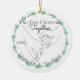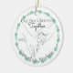 This line art displays the hands of a couple making a pinky promise surrounded by a simple red and green holly berry wreath with the caption, “Our First Christmas Together,” with personalization for the names. The year 2024 appears on the left side of the ornament. The wreath is also on the back of the ornament, and there is a small text box for leaving a sweet note, the date the couple made it official, or perhaps words of encouragement to the new couple.