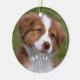 Décor chic et élégant. Ce design comprend une photo de votre ami furry avec un monogramme de prénom simple et moderne et un coeur avec accent empreinte de patte en blanc. Un motif coordonné de pois roses rousses habille le dos de l'ornement. Vous pouvez personnaliser le design pour votre nouveau chiot / chat, le chien de votre famille, le chat ou l'animal de compagnie.