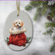 Sur le devant de cet ornement de Noël est l'image d'un adorable chien chiot blanc de caniche qui sort d'un sac cadeau de Noël rouge et blanc. Le sac est niché au milieu de pics de pin et de cônes de pin. Derrière l'image se trouve un arrière - plan à confettis doré. Le dos de l'ornement a plusieurs champs de texte pour vous de personnaliser chaque ornement. Parfait pour une fille, un fils, une nièce, un neveu, une petite-fille ou un petit-fils qui aime les chiens, surtout les canicules!