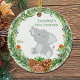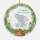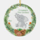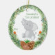 Célébrez le premier Noël du bébé avec cet éléphant mignon, bébé, au milieu d'une belle couronne naturelle de pin avec des cônes de pin et des baies.