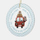 Notre premier Noël en tant que voiture de parents avec cadeaux photo parties scintillant bleue en céramique ornement. La façade comporte une voiture avec un cerf et des cadeaux et le texte "Notre premier Noël comme une famille de trois" et une bordure de flocons de parties scintillant bleue et l'arrière la photo du bébé garçon avec la même bordure. Changez de photo et ajoutez vos détails !