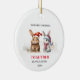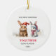 Amusant et mignon ornement de Noël pour tous les couples heureux. Il comporte quelques mignons lapins, portant des chapeaux de Père Noël. Facile à personnaliser avec votre nom et votre année