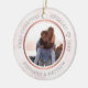 Cet ornement de Noël personnalisé présente un design d'or faux rose moderne sur arrière - plan en marbre rose. Personnalisez les noms, l'année et la photo. Ce modèle fonctionne mieux avec les photos au format paysage avec le couple au centre.