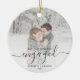 Commémorez votre fiançailles avec ce magnifique ornement de gardien moderne. Le texte en gris fusain dit "Notre premier Noël engagé", avec le mot "engagé" dans un élégant script d'écriture manuscrite avec des fioritures avant et après. Remplacez l'exemple d'image par votre photo préférée, et ajoutez vos noms et l'année. Un filtre dégradé blanc permet de faire apparaître le texte.