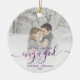 Commémorez votre fiançailles avec ce magnifique ornement de gardien moderne. Le texte violet dit "Notre premier Noël engagé", avec le mot "engagé" dans un élégant script d'écriture de faux papier avec des fioritures avant et après. Remplacez l'exemple d'image par votre photo préférée, et ajoutez vos noms et l'année. Un filtre dégradé blanc permet de faire apparaître le texte.