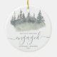 Commémorez votre fiançailles avec ce magnifique ornement de conservation rustique. Le texte vert sage dit "Notre premier Noël fiancé", avec le mot "fiancé" dans un texte élégant avec des fioritures avant et après. L'illustration de l'aquarelle présente une scène forestière hivernale d'arbres à feuillage persistant dans des tons de sauge vert et gris.