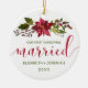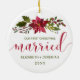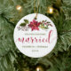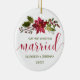 Cet élégant ornement de vacances est parfait pour les jeunes mariés. Le design comprend une fleur de poinsettia aquarelle et houx avec des baies rouges. Ci-dessous, il est lu dans la typographie moderne rouge et vert script "Notre premier Noël, Marié" avec vos noms et l'année ci-dessous pour vous de personnaliser. Conçu par ©Susan Coffey.