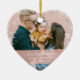 Elégant et chic "Our First Christmas", ensemble personnalisé ornement de Noël photo (en forme de coeur) pour les couples récents, avec typographie moderne cursive / lettrage à la main sur un groupe semi-transparent rose pêche, et un cadre de flocons de neige blanc et argent et de petites étoiles. Assurez-vous de personnaliser les deux photos, le nom de famille et l'année.
