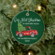 Script moderne de brosse Notre premier Noël dans notre nouvel ornement de maison comprend Watercolor Vintage Camion rouge avec arbre de Noël. Arrière - plan vert forestier. Photo De Retour.