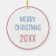Ce joli ornement en céramique de vacances d'inspiration côtière dispose d'un garde-vie bleu et blanc nautique orné d'un arc rouge et de lumières de Noël. Personnalisez avec votre choix de nom et de texte spécial de vacances à l'avant et à l'arrière.