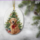 Sur le devant de cet ornement de vacances est l'image d'un joli chien Golden Retriever portant un arc rouge festif. Le chien est assis devant un Holiday tree décoré. Au verso, le texte rouge et vert indique MERRY CHRISTMAS", et il y a des champs de texte supplémentaires pour vous de customiser. Faites-le dire ce que vous voulez !