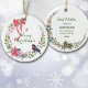Voici un joli ornement de Noël qui est approprié comme un cadeau de famille à n'importe qui. La façade est ornée d'une jolie couronne de vacances avec un arc rouge, des baies rouges, un poinsettia et un petit oiseau d'hiver. Un champ de texte personnalisé en vert est au centre. Le dos a une autre couronne avec des cônes de pin, et plus de champs de texte pour votre propre message. Faites-le dire ce que vous voulez !