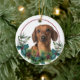 A l'avant de cet ornement de Fêtes se trouve un beau portrait d'un chien Dachshund rouge brun qui regarde d'un chandail saint et à feuillage persistant. Les baies rouges et les cônes de pin ornent les sprigs de houx et de pin. L'image est placée sur un cercle blanc à l'intérieur d'un cercle mince de ligne rouge. L'arrière de l'ornement a la même couronne à feuillage persistant et rond avec votre texte personnalisé en rouge.