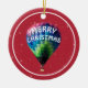 Cette montgolfière s'appelle Gooberfish. Il est coloré dans les tons rose, bleu et vert et est exposé sur un arrière - plan rouge étincelant. L'ornement dit : Joyeux Noël devant et derrière. Personnaliser avec nom de famille et année.