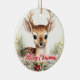 Conception conviviale et festive pour l'ornement des arbres de Noël en céramique avec de l'aquarelle de petits rennes avec la verdure de Noël et la typographie "Joyeux Noël" baie et rouge. Impressions violettes