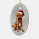 Sur le devant de cet ornement de Noël est l'image d'un Rhodesian Ridgeback chien portant un chapeau de Père Noël et enveloppé de lumières de Noël colorées. L'image est placée contre un arrière - plan festif de livres d'argent. Le dos de l'ornement a un texte en rouge, or et vert.