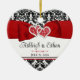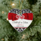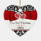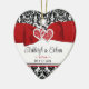 Ce ornement personnalisé et romantique en forme de coeur "Notre premier Noël" a un motif damassé noir et blanc en haut et en bas avec un ruban rouge et une image d'arc avec des images de coeurs joints en haut. Sous le ruban, les mots "Notre premier Noël" sont imprimés en noir avec l'année ci-dessous en écriture noire sur un côté avec les noms du couple heureux et la date mariage imprimée sur l'autre avec des rouleaux rouges décoratifs entre les deux lignes de chaque côté. Si vous avez besoin d'autres éléments correspondants, envoyez un courriel à niteowlstudio@gmail.com et regardez vos dossiers de pourriels/pourriels pour ma réponse, ou utilisez la fonction conversation Zazzle pour me contacter.