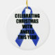 Un ruban bleu accroché sur le sapin de Noël dans le mémorial pour quelqu'un de spécial qui est décédé du cancer du côlon.