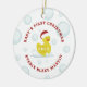 Illustration d'un jouet de bain de canard en caoutchouc jaune portant un chapeau de santa entouré de bulles. Personnalisez avec le nom et l'année du bébé. Personnalisez la photo à l'arrière.