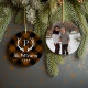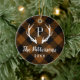 Un ornement de vacances personnalisé personnalisé avec votre monogramme et photo de famille. Ce design rustique moderne présente votre initiale monogramme avec des bois de cerf sur un arrière - plan en cuivre et en buffle noir. Utilisez les outils de conception pour modifier la couleur et les polices arrière - plans afin de customiser votre propre conception unique. Ajoutez votre photo de famille ou du texte supplémentaire à l'arrière.
