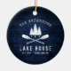 Un magnifique ornement de céramique à thème rustique, avec votre nom de famille et "Lake House" ou tout autre texte désiré avec sa date et son emplacement établis. Ce design personnalisé et unique présente une silhouette blanche de barques croisées et de pins sur un imprimé de planches de bois aux couleurs bleues riches. Un joli complément à votre maison de vacances, décoration d'arbre de Noël de vacances. Pour voir d'autres modèles comme celui-ci, n'hésitez pas à visiter ma boutique ici à "Zazzle.com/Rustic_Charm". Merci .