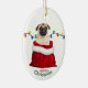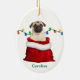Sur le devant de cet ornement de Fêtes est l'image d'un adorable chien de Carlin dans un sac cadeau de Noël. Derrière le chien se trouve une série de lumières colorées de Noël. Le texte en bas dit "Joyeux Noël". Le dos de l'ornement a la même image avec un champ de nom personnalisé.