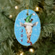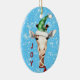 Sur le devant de ce joli ornement de Noël pour enfants est une girafe comique à long cou, portant un foulard rouge et un chapeau de Santa fleur de fleur de neige vert. À côté de lui, il y a un texte rouge qui dit JOY. L'image et le texte sont placés sur un arrière - plan bleu avec des flocons de neige blancs. L'arrière de l'ornement a la même bordure arrière - plan de flocon de neige avec un ovale blanc qui tient votre texte personnalisé en bleu et rouge correspondant. Parfait pour maman et papa à donner à un fils ou une fille, ou pour les grands-parents, les oncles et les âmes, aussi.